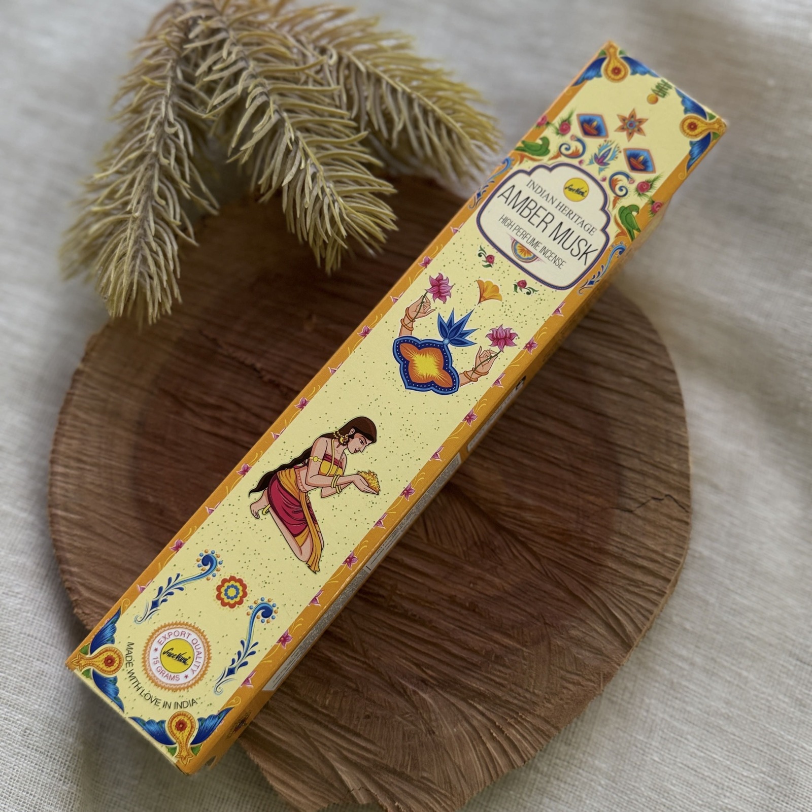 Incenso de vareta (massala) | Aroma Amber Musk | Conteúdo: 15g (aprox. 12 varetas) | Marca: Indian Heritage