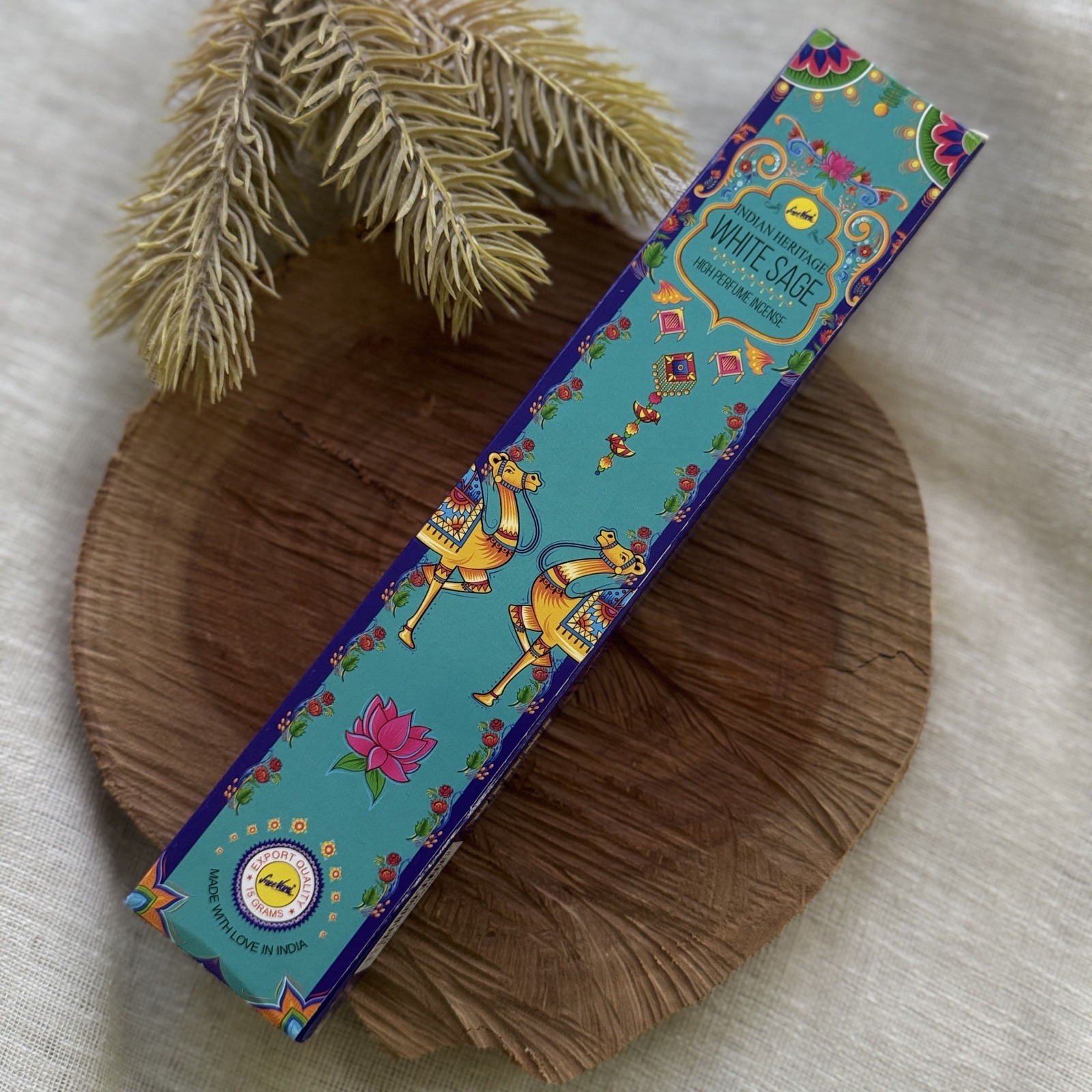 Incenso de vareta (massala) | Aroma White Sage (Sálvia Branca) | Conteúdo: 15g (aprox. 12 varetas) | Marca: Indian Heritage